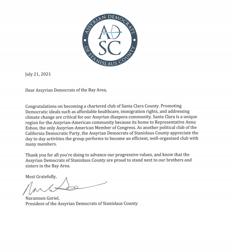We are pleased to receive the letter below from our fellow Assyrian Democrats of the Stanislaus County. We are looking forward to working closely with them, on a variety of issues important to our Assyrian American community.