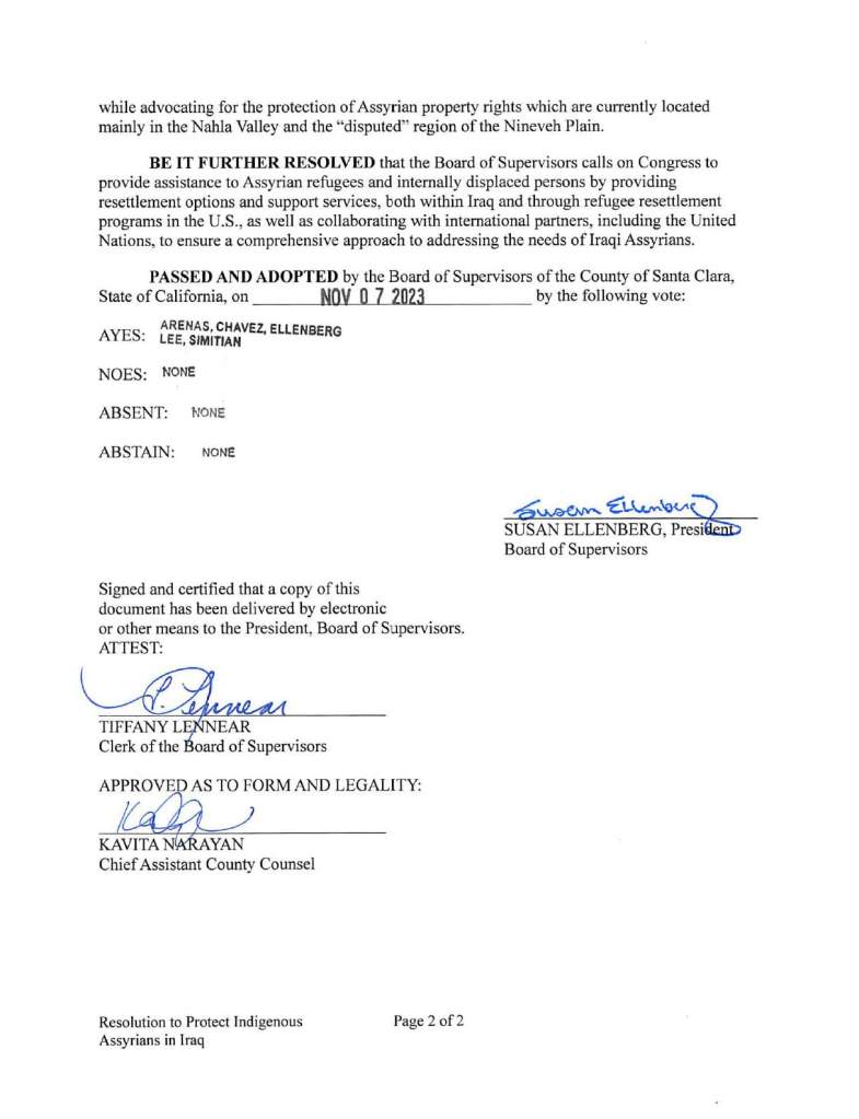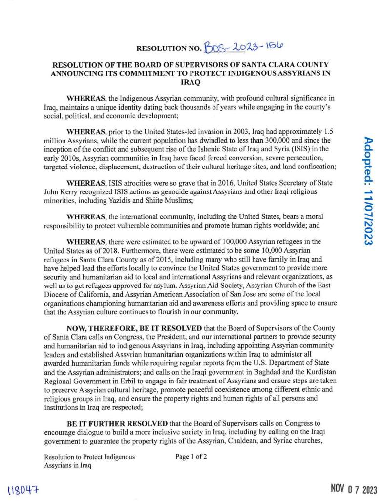 On November 7, 2023, the Santa Clara County Board of Supervisors unanimously approved Resolution BOS-2023-156, expressing its commitment to safeguard the indigenous Assyrian community in Iraq and acknowledging their cultural heritage and pivotal role in shaping Iraq’s future.